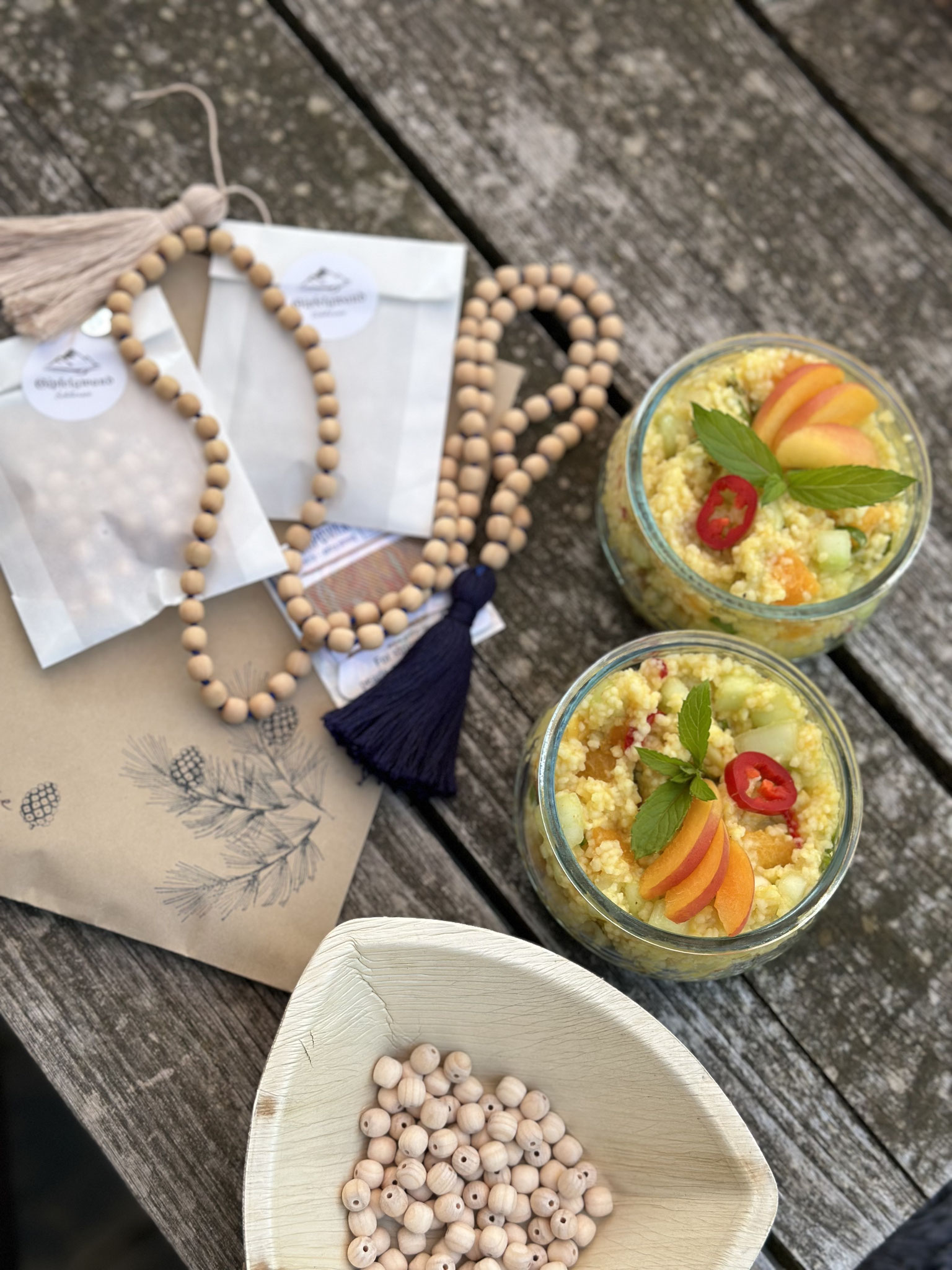 Mit dem Duft von Zirbenholz in der Luft lernst Du Schritt für Schritt, wie Du Deine eigene Mala-Kette knüpfst.